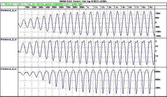 It is important to keep small steep of integration – Backward Euler formula is used currently and it is sensitive to step size. Present results are obtained with step 1.e-9 sec = 1 ns, i.e. 100 points over period. Less step size may show other behavior, for example decaying of oscillations.